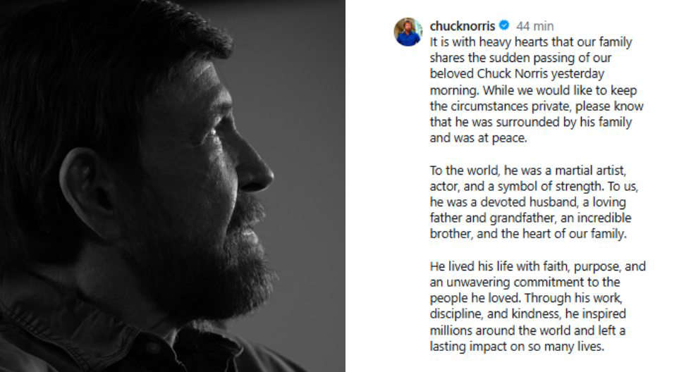 En un comunicado difundido públicamente, sus seres queridos expresaron su dolor por la partida del actor. “Con profunda tristeza, nuestra familia comparte el repentino fallecimiento de nuestro querido Chuck Norris”, indicaron, señalando además que el artista estuvo acompañado por su familia en sus últimos momentos y que descansó en paz.