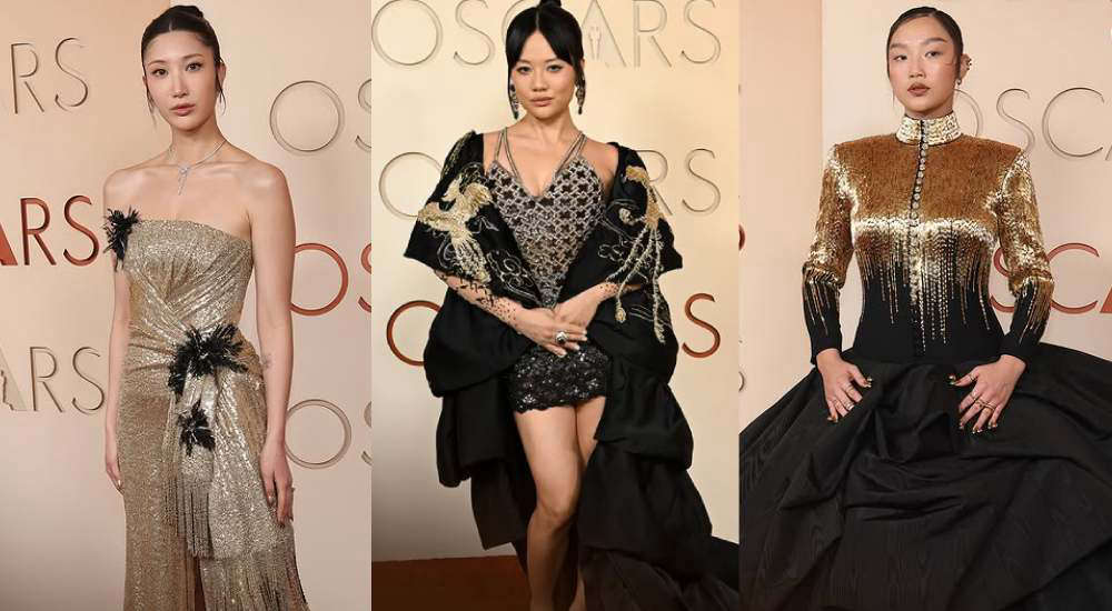 Las guerreras k-pop, HUNTR/X, también se hicieron presente en la alfombra roja de los Oscar 2026. Ejae viste un vestido largo dorado sin tirantes, con pedrería brillante, detalles negros decorativos y flecos que aportan movimiento, complementado con un peinado recogido y un collar delicado. Rei Ami apuesta por un look más moderno con un vestido corto negro con pedrería plateada y una capa amplia negra con bordados dorados estilo oriental, acompañado de pendientes largos y maquillaje sofisticado. Nuna destaca con un vestido estructurado en negro y dorado, de cuello alto y mangas largas con lentejuelas degradadas y una falda voluminosa, completando el conjunto con un peinado pulido y maquillaje elegante.