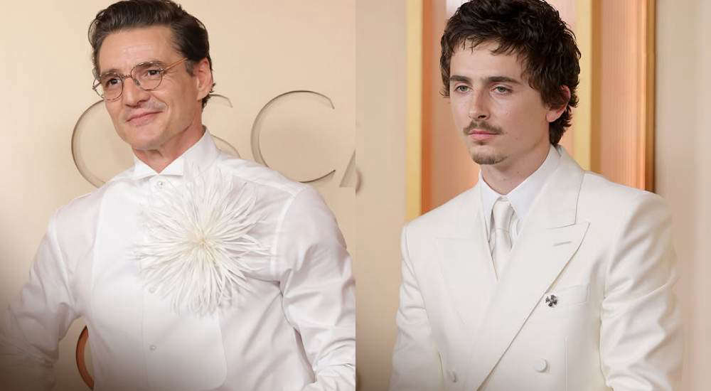 Pedro Pascal lleva una camisa blanca de corte clásico, que destaca por un llamativo adorno en el pecho con forma de flor o explosión de plumas, aportando un toque artístico y moderno al conjunto; además, complementa el estilo con gafas de montura delgada y un peinado prolijo hacia atrás que refuerza su apariencia refinada. Timothée Chalamet viste un traje blanco de corte sastre con chaqueta cruzada y solapas definidas, acompañado de una camisa y corbata del mismo tono, creando un look monocromático muy pulido; su estilo se completa con un peinado ligeramente despeinado y un aire más juvenil y relajado, que contrasta con la formalidad del traje.