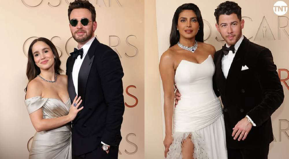 La actriz Priyanka Chopra y el cantante Nick Jonas deslumbran con un look elegante y sofisticado en la alfombra roja de los Premios Oscar. Ella luce un vestido largo blanco sin tirantes, de silueta ajustada, con un escote corazón que resalta la parte superior. Por su parte, él apuesta por la clásica elegancia con un esmoquin negro perfectamente entallado, acompañado de camisa blanca, corbatín negro y pañuelo blanco en el bolsillo del saco.