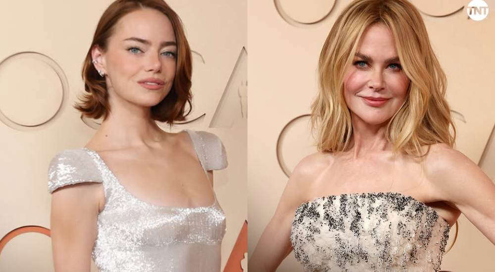 Emma Stone luce un vestido plateado cubierto de lentejuelas que aporta brillo y glamour. El diseño tiene un escote cuadrado y pequeñas mangas estructuradas que enmarcan los hombros. Complementa el look con un peinado bob corto ligeramente ondulado, maquillaje natural en tonos suaves y delicados aretes, logrando una apariencia moderna y refinada. A la derecha, Nicole Kidman viste un vestido strapless en tono claro con aplicaciones de pedrería y detalles en negro que crean textura y contraste. El diseño resalta la zona del busto con un efecto bordado que aporta elegancia. La actriz lleva el cabello rubio suelto, con ondas suaves a la altura de los hombros, y un maquillaje luminoso y discreto que realza su rostro, completando un look clásico y muy sofisticado.