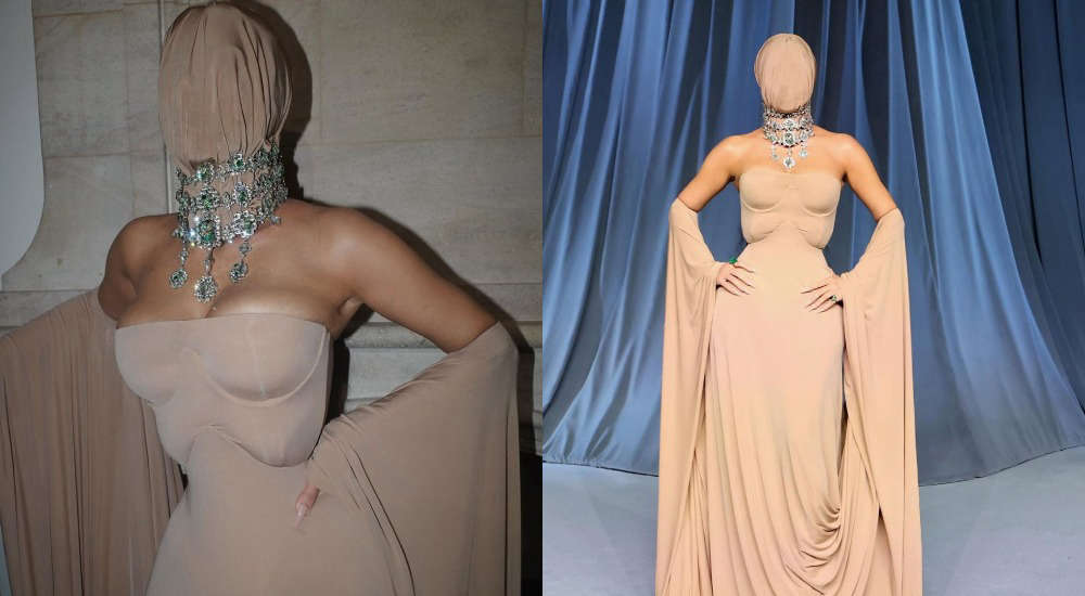 La celebridad, de 44 años, combinó la mascarilla con un elegante vestido corset sin tirantes y mangas drapeadas, perteneciente a la colección Maison Margiela Alta Costura Otoño 2025. El conjunto se completó con uñas largas en el mismo tono nude, logrando una estética monocromática que resaltó su elegancia.