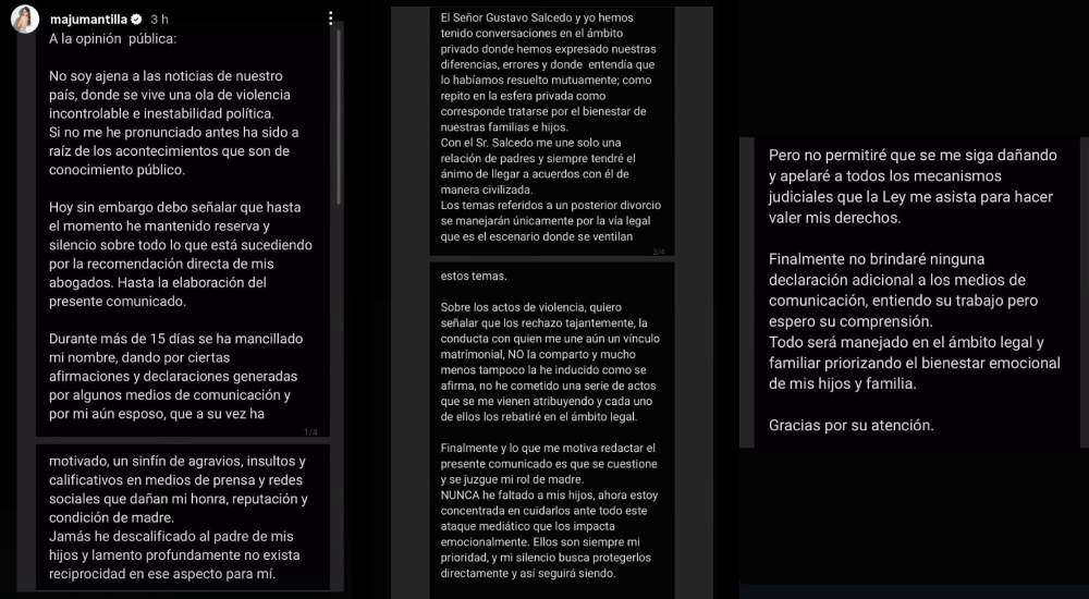 “Durante más de 15 días se ha mancillado mi nombre, dando por ciertas afirmaciones y declaraciones generadas por algunos medios de comunicación y por mi aún esposo”, expresó Maju Mantilla al iniciar su comunicado publicado en redes sociales. Con esas palabras, la exreina de belleza marcó su posición ante la ola de comentarios que ha enfrentado en las últimas semanas.