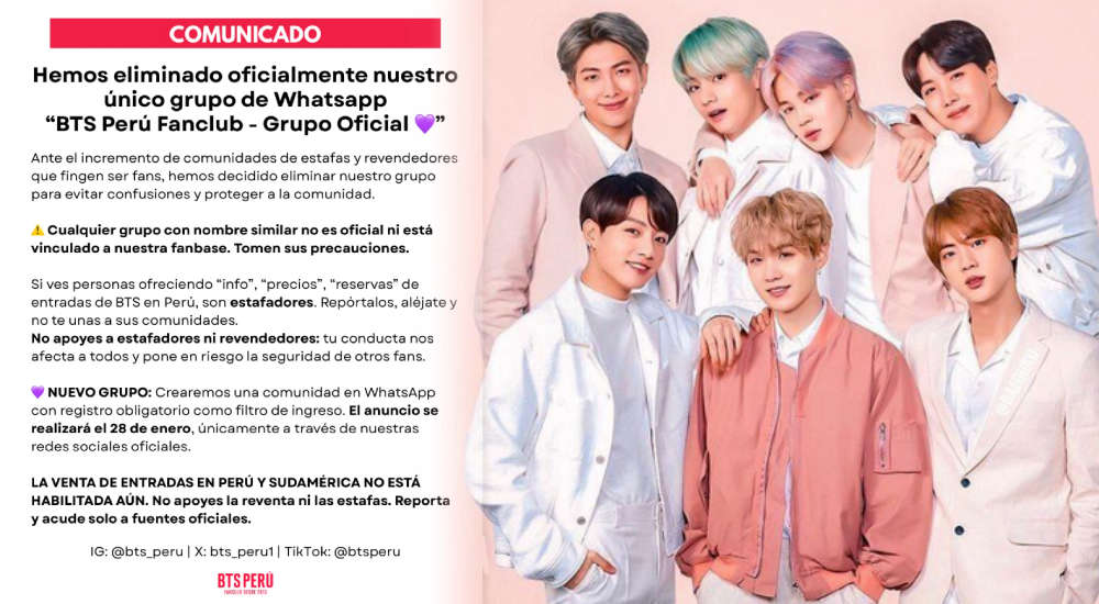 De acuerdo al comunicado emitido en Instagram, BTS_Perú decidió eliminar oficialmente el único grupo de WhatsApp oficial. Esta medida se tomó ante el incremento de estafas. "Hemos decidido eliminar nuestro grupo para evitar confusiones y proteger nuestra comunidad", indica una parte de la publicación.